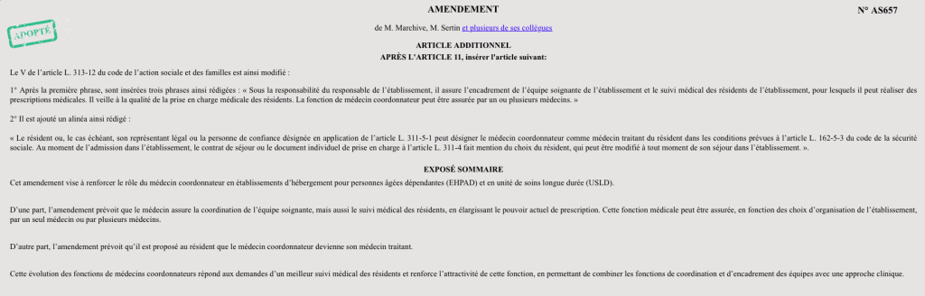 C’est sur la base de ce constat que j’ai proposé que le médecin coordonnateur soit chargé du suivi médical des résidents et que son pouvoir de prescription soit élargi. Avec cet amendement, chaque résident pourra désormais choisir le médecin coordonnateur comme médecin traitant dès son entrée à l’EHPAD.