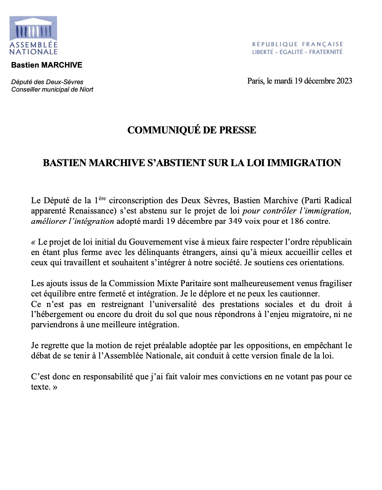 Le Député de la 1ère circonscription des Deux Sèvres, Bastien Marchive (Parti Radical apparenté Renaissance) s’est abstenu sur le projet de loi pour contrôler l’immigration, améliorer l’intégration adopté mardi 19 décembre par 349 voix pour et 186 contre. « Le projet de loi initial